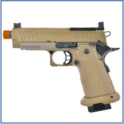 The real Staccato P is approved for duty by more than 1,300+ law enforcement agencies and carried by elite units like the Texas Rangers and the US Marshals Special Operations Group, as well as thousands of officers across the country. The P is finely crafted with wide lightening cuts at the front and rear of the slide providing superior grip while racking it back, reduced recoil and improved cycling speed. The slide is RMR ready and comes with a RMR plate for the installation of your favorite reflex dot sight. Additionally, slide comes equipped with a fiber optic front sight and a tall rear sight that allowing continued functionality when a reflex dot sight is installed. The P metal frame is a robust and nicely weighted for a more realistic look and feel and comes with an under barrel accessory rail for your favorite lights or lasers. Preinstalled is a hand-stippled polymer grip which provides a comfortable and secure hold. Other features include a skeletonized trigger and textured trigger guard continuing to provide more stability while firing. The icing on this cake is the authentic licensed logos, patterns and roll marks of Staccato.