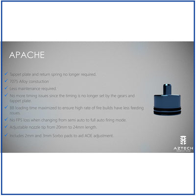 Aztech Innovations presents an air controlled cylinder head that allows you to remove your tappet plate and spring. This all in one sealed cylinder head ensures a perfect seal for max air flow and zero air loss on semi with out any mechanical gear driven parts to create issues. This system removes any timing issues or springs breaking and also reduces the drop of fps on full auto. It has been tested on full auto all the way up to 75rds at over 400fps with only a average drop of 15fps on full auto.