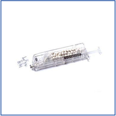 Pour bbs into the loader, align the nozzle and push the pump to load the magazine.