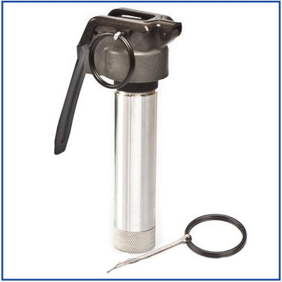 A Thunder B is an Airsoft simulation grenade that emits noise. It holds a standard 12 gram CO2 cartridge in a fully sealed compartment. Upon pulling the pin, the fire lever, or spoon, snaps down puncturing the CO2 cartridge and starts releasing the pressure from the cartridge until the shell breaks due to air pressure inside the shell resulting in a loud pop sound.
