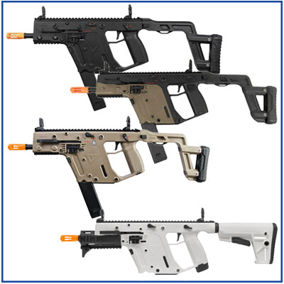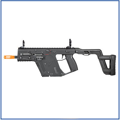 Developed by world-renowned firearm developer KRISS Arms, the Krytac Kriss Vector SMG AEG Airsoft Gun was engineered as an accurate training platform. While this gun doesn't use the innovative KRISS Super V System featured in the original, which redirects the bolt-off axis into a recess cavity behind the magazine well, it is designed to mimic its feel. This provides the shooter with superior control and quick follow-up shots, making it a popular choice for tournament-level play. The black Krytac Kriss Vector is made with high-quality materials for durability and strength, including a lightweight yet high-impact polymer receiver and folding stock plus MIL-STD 1913 Picatinny rails along the bottom of the handguard and across the full length of the upper receiver. The insides of this next-level AEG are pretty impressive, too, with an 8-millimeter gearbox that lets you plug in the battery and go. A quick-change spring system and an integrated FET system make this a popular AEG.