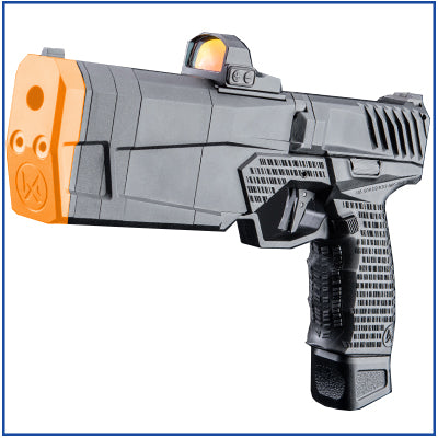 Construction of the KRYTAC Maxim 9 consists of a reinforced polymer frame with anodized aluminum slide and baffles. The baffles are modular, allowing for configuration between short (240mm) and long (275mm) versions. Under the baffles are three keymod cutouts where a short rail section can be mounted. The fixed barrel is threaded to accept a special version of the Acetech Bifrost airsoft tracer unit, designed specifically for the KRYTAC Maxim 9, and features a special orange flame mode exclusive to this model tracer. The KRYTAC Maxim 9 is micro dot optics ready with provisions for KRYTAC™s new multi-footprint mounting plate, accommodating for RMR, RMRcc, and RMS footprint optics. The KRYTAC Maxim 9 can be fired in semi-auto or full-auto and is fed through a lightweight aluminum magazine with 24 round capacity.