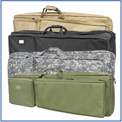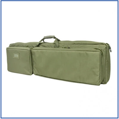 Double rifle case allows easy transport of 2 rifles. Internal Molle webbing with straps help secure rifles in place while external pockets allow additional storage of magazines or extra items.