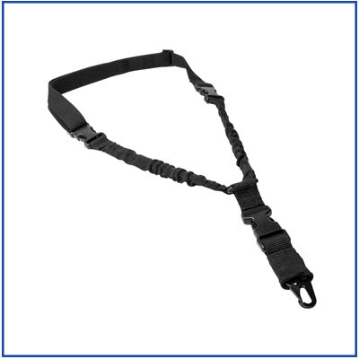 Adjustable deluxe single point bungee sling featuring three quick connect buckles and a metal spring clip.